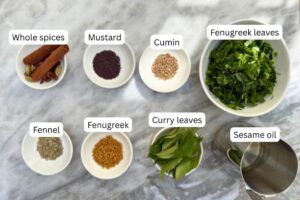 • Spices: mustard, fennel, cumin, and fenugreek seeds, whole cinnamon, star anise, cardamom